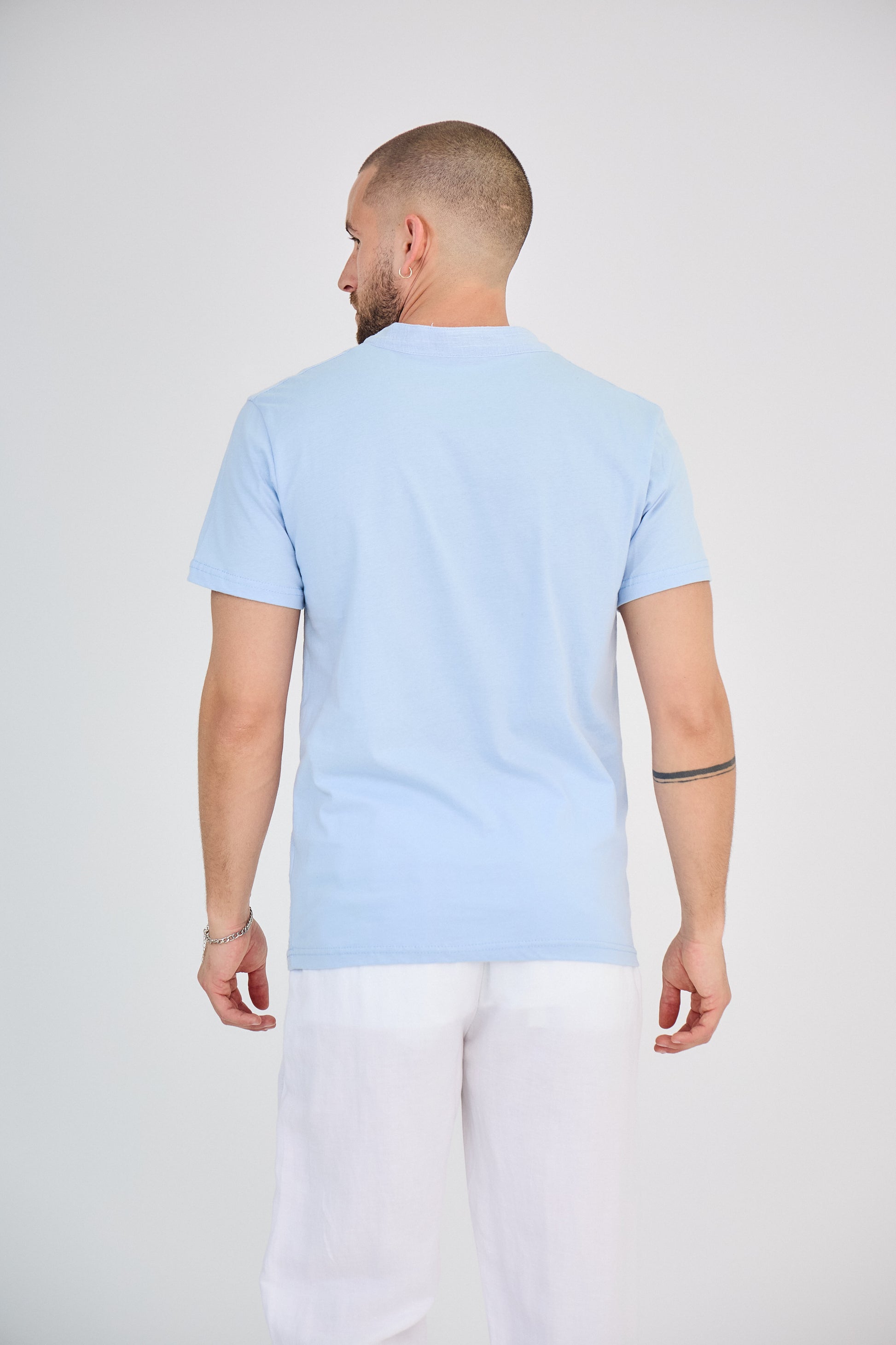 T-Shirt en Lin Manches Courtes Bleu Ciel Henley